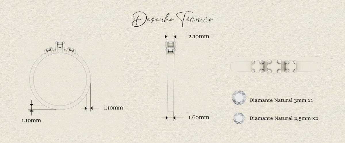 Especificações da pedras: diamante central de 3mm (10 pontos) e 2 diamantes laterais de 2.5mm (5 pontos cada)