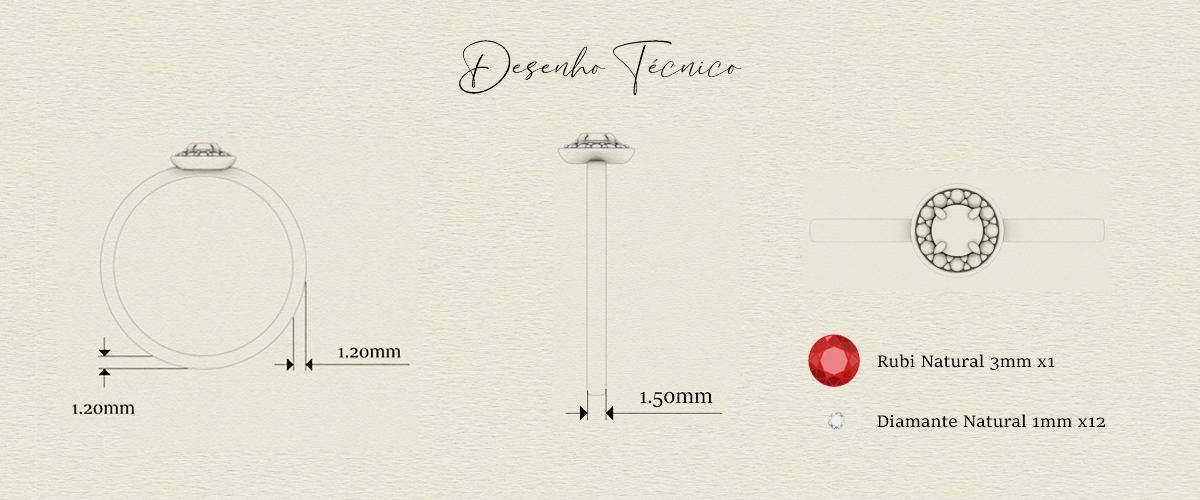 Especificações da pedras: rubi central de 3mm (11 pontos) e 12 diamantes orbitais de 1mm (0,5 pontos cada)