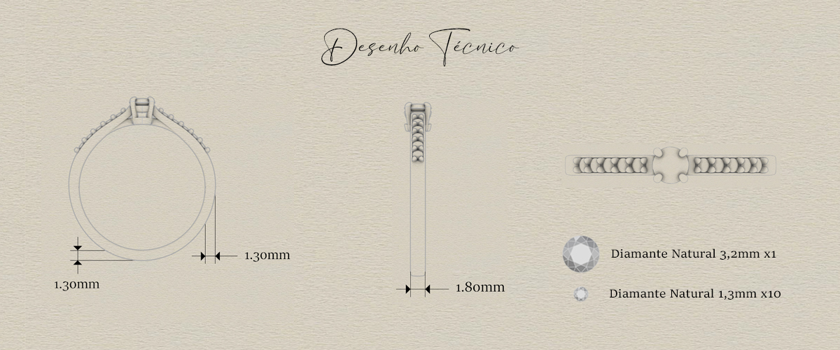 Especificações da pedras: diamante central de 3,2mm (13 pontos) e 10 diamantes de 1,3mm (1 ponto cada) no aro