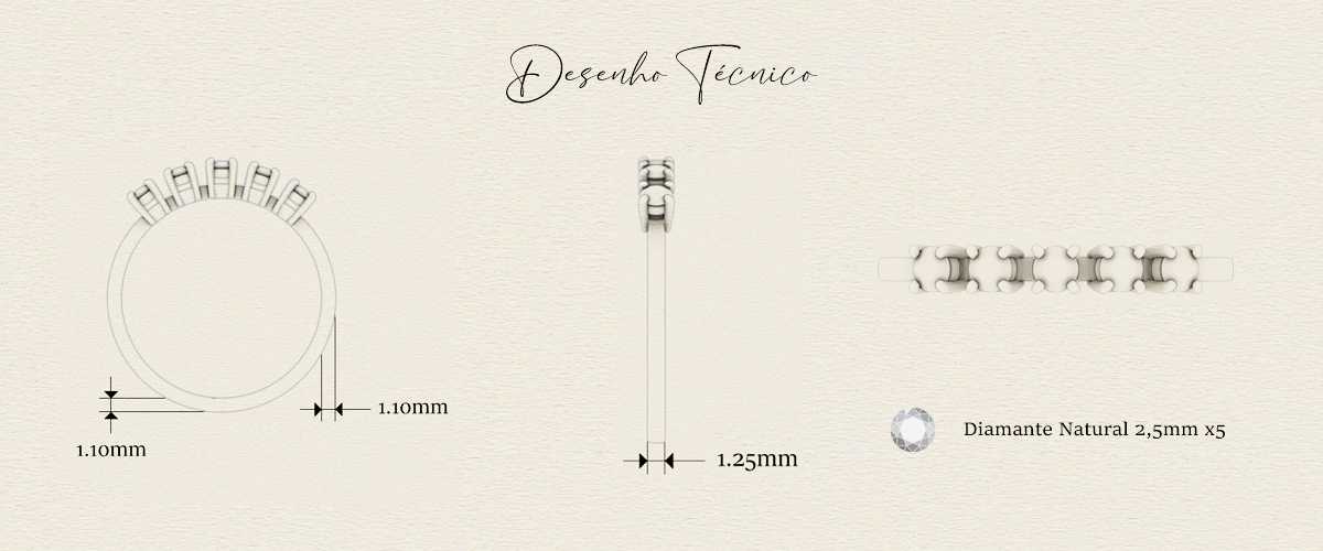 Especificações da pedras: 5 diamantes naturais de 2,5mm (5 pontos cada)