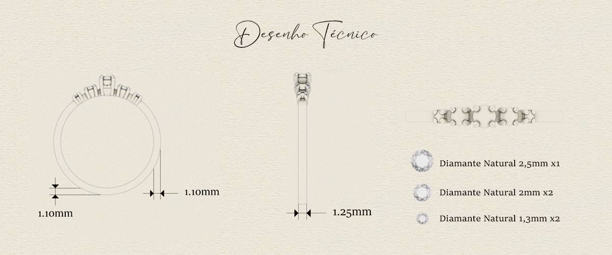 Especificações da pedras: diamante central de 2,5mm (5 pts), 2 laterais de 2.0mm (3 pts cada) e 2 laterais de 1.0mm (0,5 pts cada)