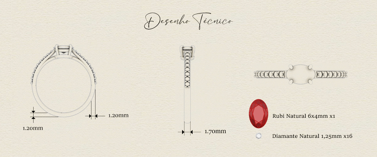 Especificação da pedra: rubi central oval 6x4mm (35 pontos) e 16 diamantes de 1,3mm (1 ponto cada) no aro
