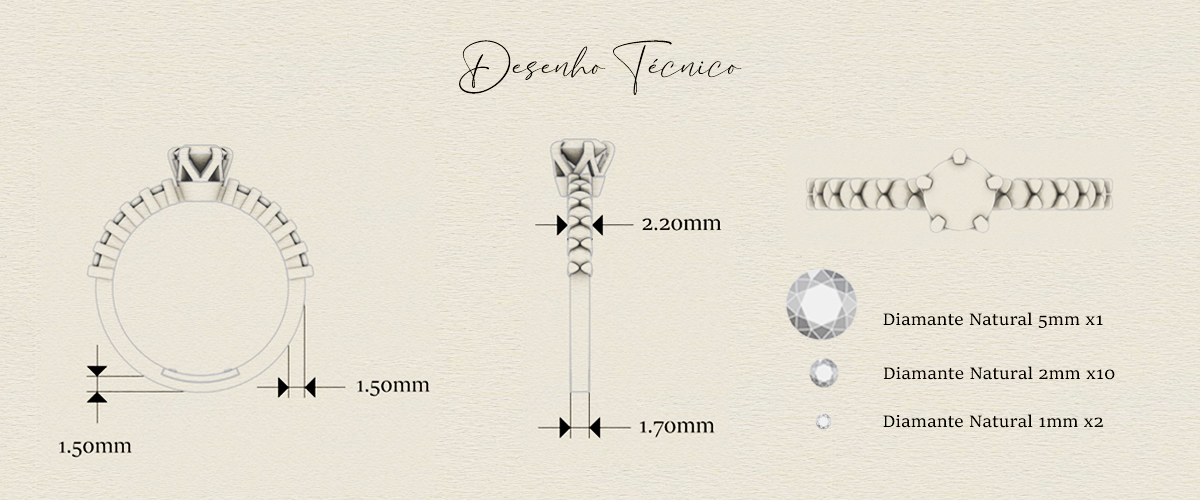 Especificações da pedras: diamante central de 5,8mm (50 pontos), 10 diamantes de 2mm (3 pontos cada) e 2 diamantes de 1mm (0,5 ponto cada) no aro