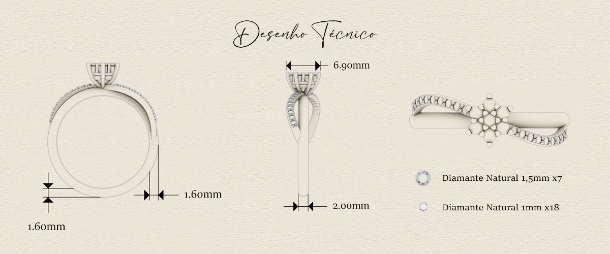 Especificações da pedras: 7 diamantes centrais de 1,5mm (1,5 pontos) e 18 diamantes de 1mm (0,5 pontos) no aro