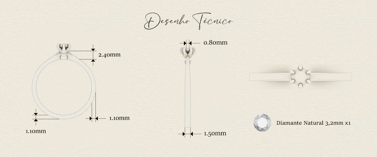Especificação da pedra: diamante central de 3,2mm (13 pontos)