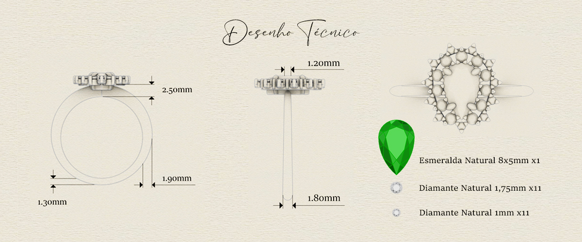 Especificação da pedra: esmeralda central gota 8x5mm (90 pontos), 11 diamantes de 1,75mm (2 ponto cada) e 11 diamantes de 1,00mm (0,5 ponto cada)