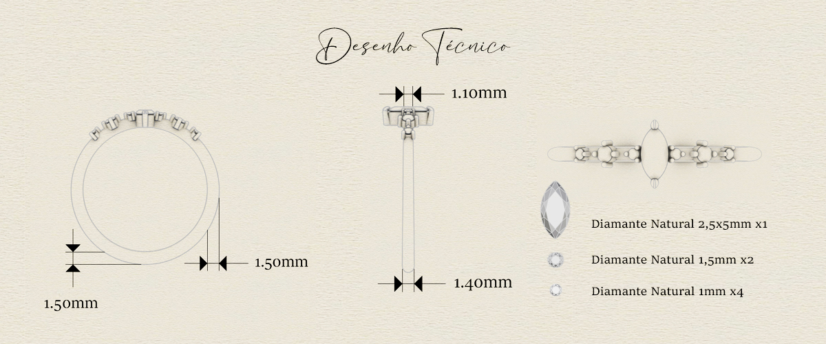 Especificações da pedras: Diamante central 2,5x5 ( 15 pontos ), 4 diamantes laterais 1mm e 2 dimanates laterais 1,5mm ( Total 20 pontos )