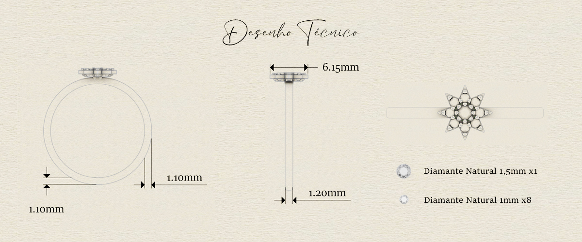 Especificações da pedras: diamante central de 1,5mm (1,5pontos) e diamantes naturais orbitais de 1mm (0,5 pontos)