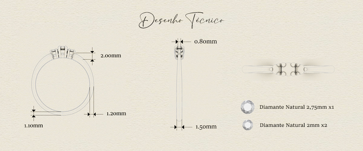 Especificações da pedras: diamante central de 2,75mm (8 pontos) e laterais de 2mm (3 pontos)