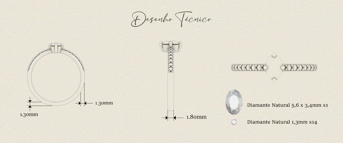 Especificações da pedras: diamante central oval de 5,6x3,4mm (30 pontos) e 14 diamantes de 1,3mm (1 ponto cada) no aro