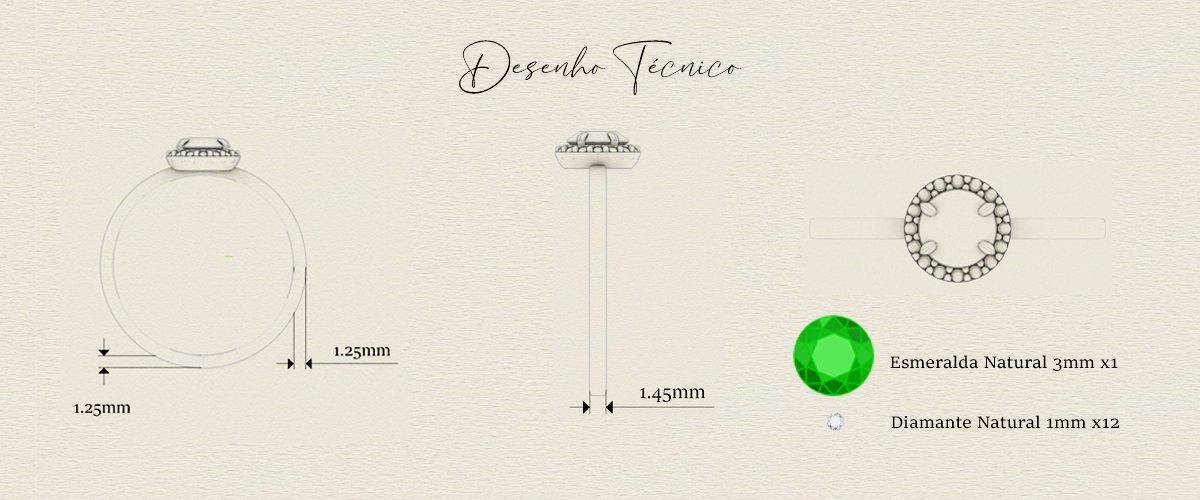 Especificações da pedras: esmeralda central de 5mm (45 pontos) e 16 diamantes orbitais de 1mm (0,5 pontos cada)