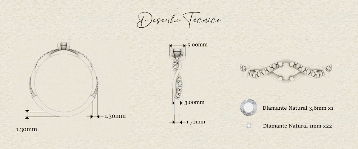 Especificação da pedra: diamante central de 3,6mm (18 pontos) e 22 diamantes de 1mm ( 0,5 pontos cada)