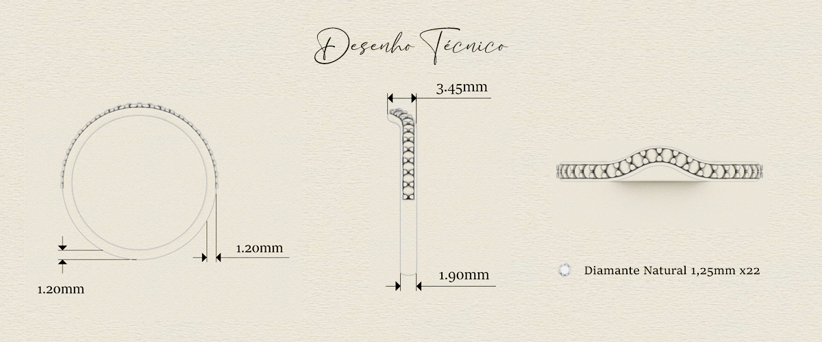 Especificações da pedras: 22 diamantes de 1,25mm (1,0 pontos cada) no aro
