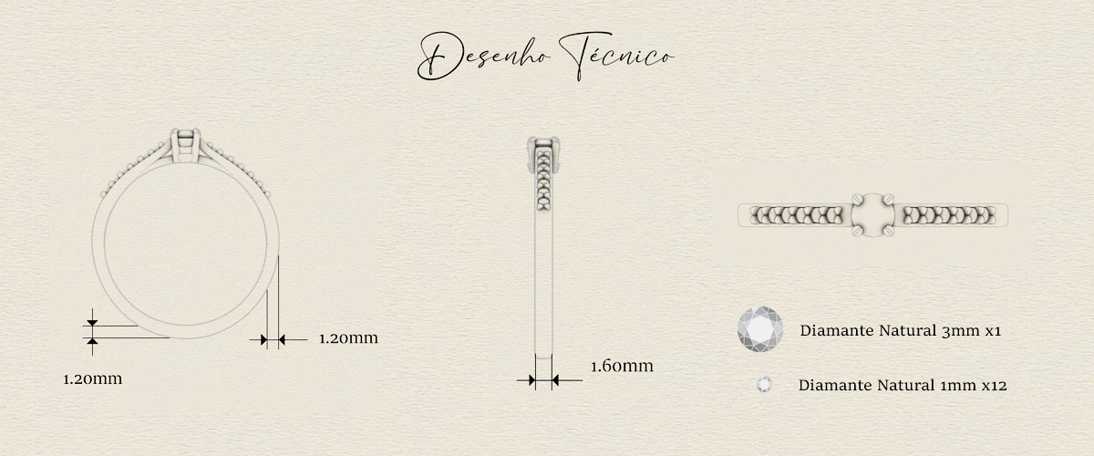 Especificações da pedras: diamante central de 3mm (10 pontos) e 12 diamantes de 1mm (0,5 pontos cada) no aro