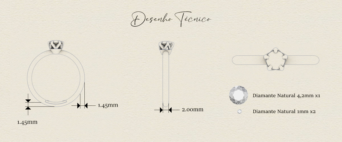 Especificações da pedras: diamante central de 4,2mm (30 pontos)