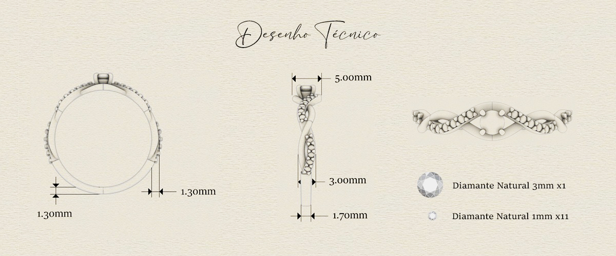 Especificação da pedra: diamante central de 3mm (10 pontos) e 22 diamantes de 1mm ( 0,5 pontos cada)
