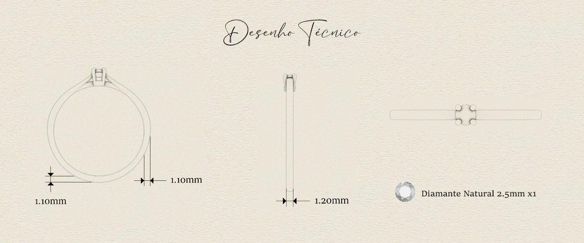 Especificação da pedra: diamante central de 2,5mm (5 pontos)